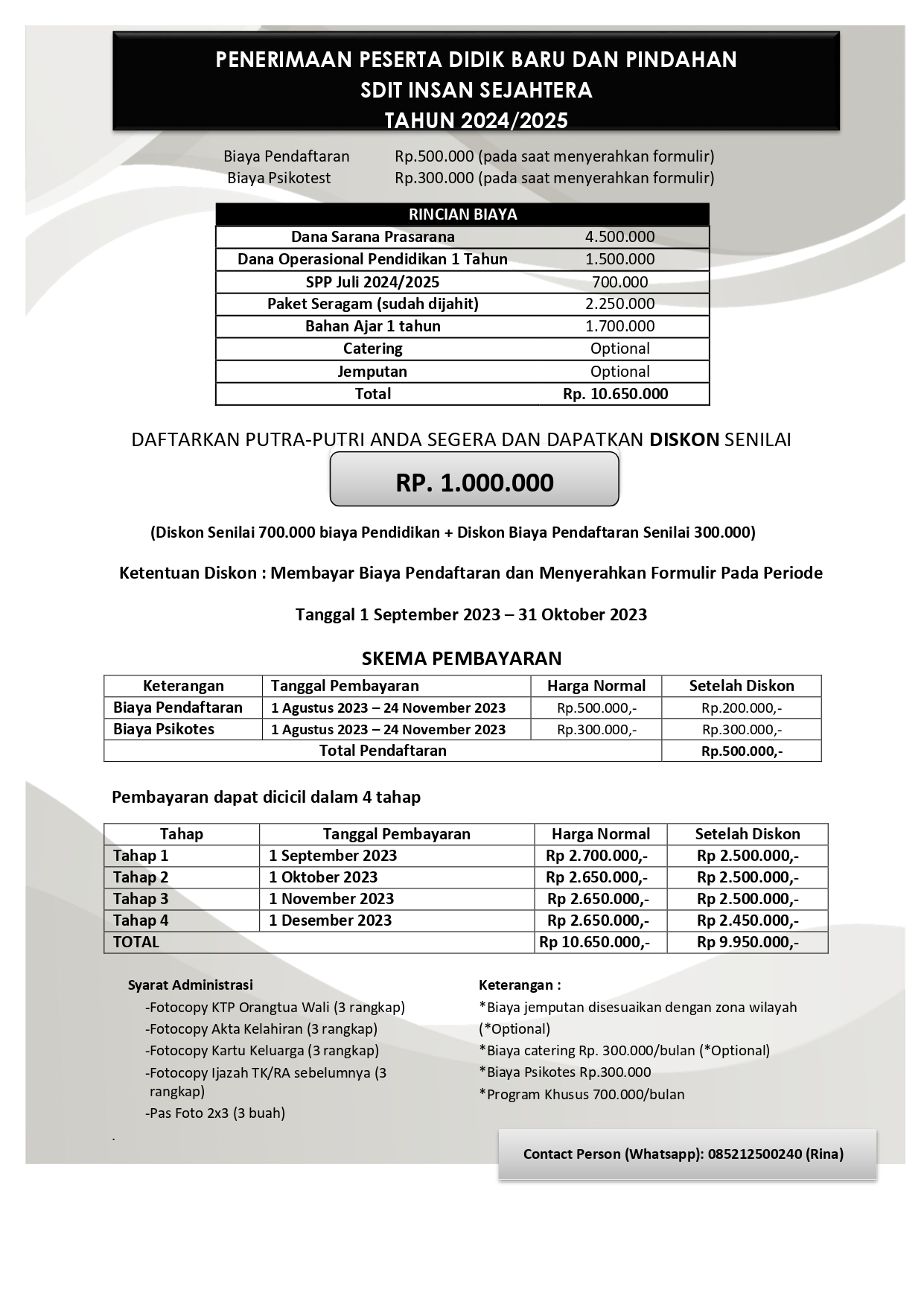 Daftarkan Putra-Putri Anda Segera pada Gelombang 1 (Periode 1 Agustus 2023 - 24 November 2023) dan Dapatkan DISKON biaya masuk Senilai Rp. 1.000.000.
